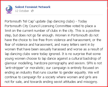 There is one group that will be free from harassment though and that is the dancers and bar staff of the clubs in Portsmouth, because no longer will they have to run the gauntlet of feminist protesters outside the venues. Perhaps the most incredible statement from SFN is the assertion that they are not 'anti-stripper'. Is this some kind of joke? So we are expected to believe that a campaign that aims to close every club in Portsmouth is not 'anti-stripper'?